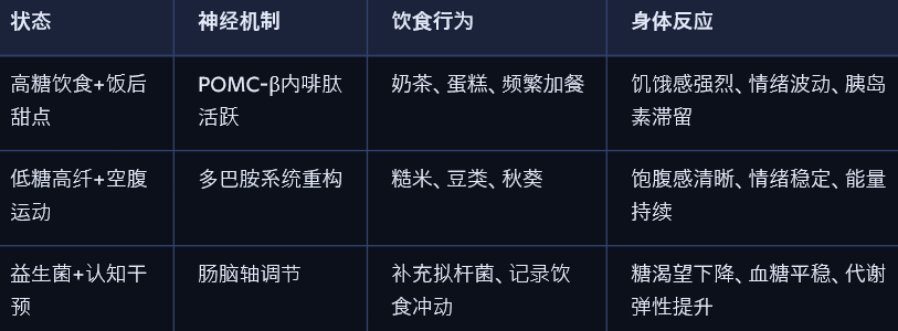 • ❌ 不要用无糖甜味剂替代糖 → 无法激活肠脑轴奖赏通路,反而加重渴望;