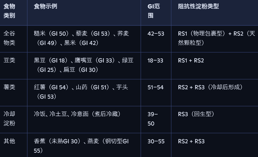 📊 低GI复合碳水与阻抗性淀粉食物清单(GI ≤ 55)