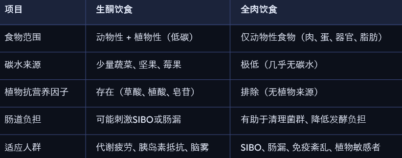 生酮饮食与全肉饮食虽同属高脂低糖策略,但在肠道状态、免疫负担与植物抗营养因子管理上有关键差异。特别在SIBO(小肠细菌过度生长)情况下,全肉饮食更适合作为代谢重启与肠道清理工具。
