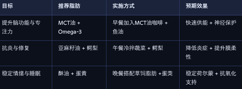 - 不饱和脂肪(植物脂肪) → 构建柔性膜,提升信号传导与抗炎能力。