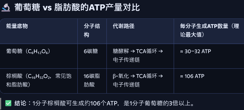 - 每1分子脂肪酸可生成远超葡萄糖的ATP;