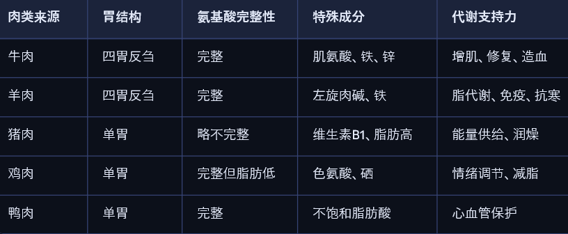 📌 例证:不同肉类蛋白质结构与代谢表现对比