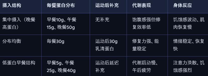 • 蛋白质摄入应与昼夜节律同步,避免“蛋白堆积”或“修复空窗”。