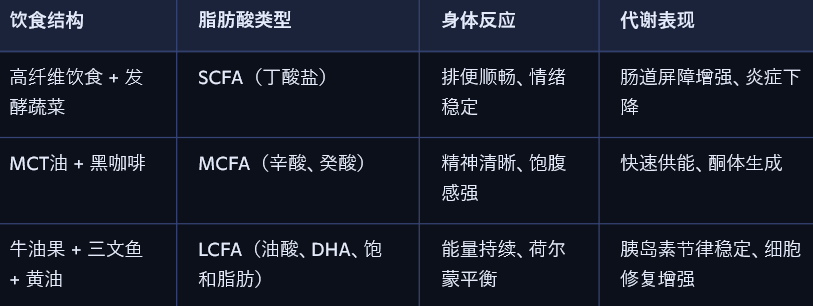 • ✅ 建议每日脂肪摄入结构为:SCFA(肠道生成)+ MCFA(1–2茶匙)+ LCFA(正餐搭配);