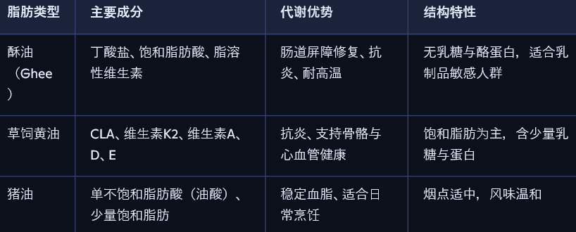 酥油(Ghee)因其高温稳定性与丁酸盐含量,成为肠道修复与高温烹饪的首选;
