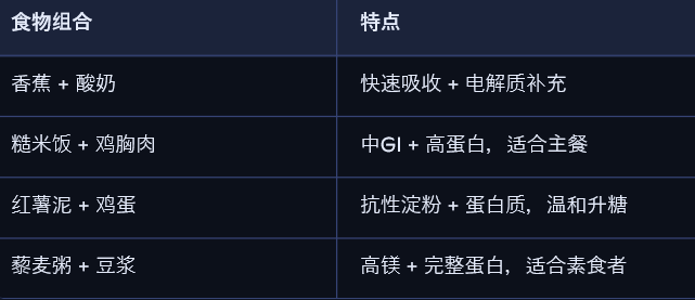 • 搭配蛋白质(如蛋、酸奶、乳清蛋白) → 提升糖原合成效率;
