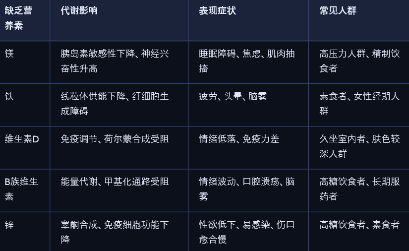 当饮食中缺乏关键营养素,如镁、锌、维生素D、B群、铁等,代谢通路将无法顺利运行,导致能量生成受阻、激素合成紊乱、免疫系统失衡。