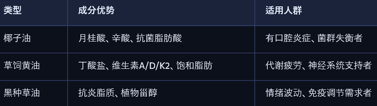 • 菌群调节作用:椰子油中的月桂酸具有天然抗菌性,草饲黄油富含丁酸盐与脂溶性维生素,有助于菌群平衡;