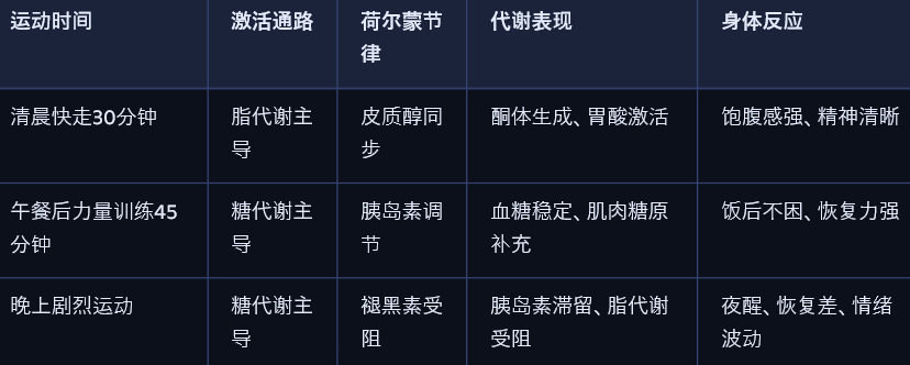 • 稳定运动节律 → 荷尔蒙节律同步 → 代谢系统更稳定。