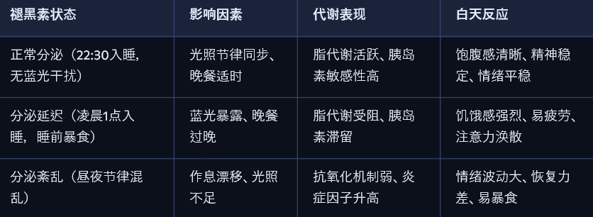 • 褪黑素紊乱 → 脂代谢受阻 → 糖代谢主导 → 易储脂、易疲劳。