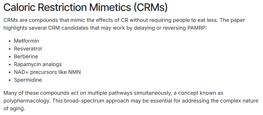 CRMs are compounds that mimic the effects of CR without requiring people to eat less. The paper highlights several CRM candidates that may work by delaying or reversing PAMRP:
