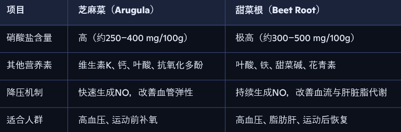 • 芝麻菜与甜菜根富含天然硝酸盐(NO₃⁻);