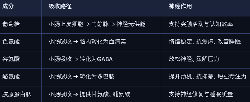 葡萄糖是神经元的首选能量来源,氨基酸(如色氨酸、谷氨酸)是血清素、GABA、多巴胺等神经递质的前体。
