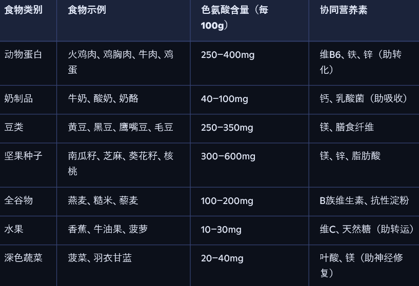 富含色氨酸(Tryptophan)的食物是支持血清素合成、情绪稳定与睡眠质量的关键营养来源。以下是常见的高色氨酸食物分类与实操建议: