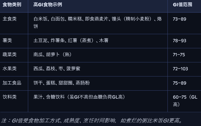 • 高GI食物消化快 → 葡萄糖迅速进入血液 → 血糖飙升;