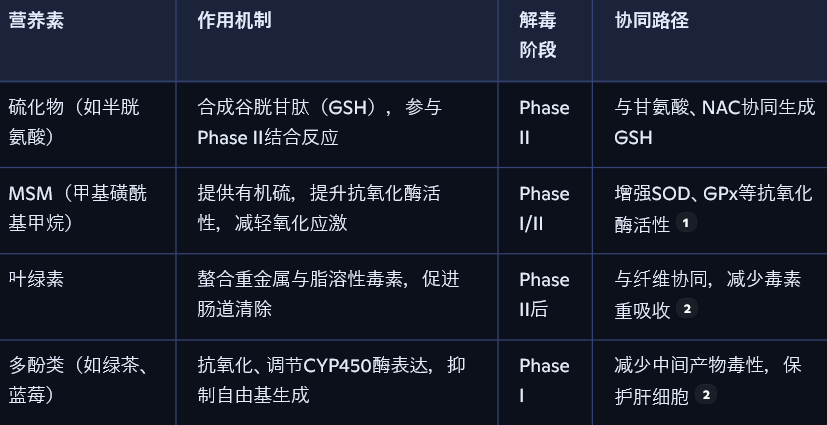 硫化物(如半胱氨酸)是谷胱甘肽合成的前体,MSM(甲基磺酰基甲烷)是有机硫的补充来源,叶绿素可螯合毒素并支持肠道清除,多酚类则通过抗氧化与酶调节作用协同解毒。