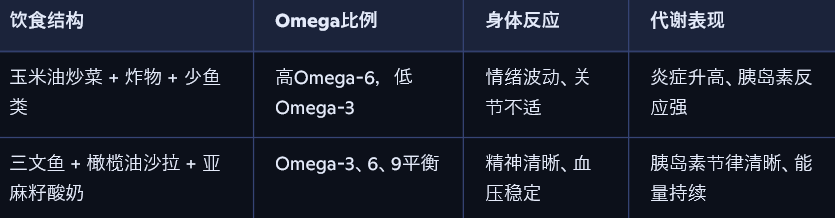 - 过量Omega-6 + 缺乏Omega-3 → 慢性炎症、胰岛素抵抗、心血管风险上升;