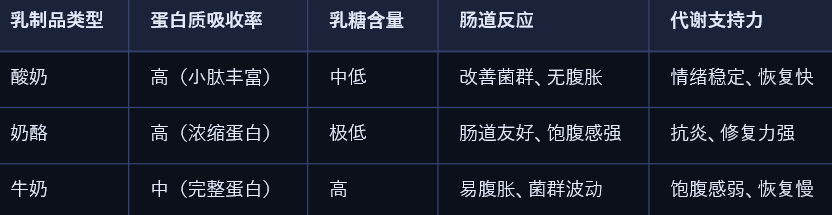 本节将比较酸奶、奶酪与牛奶在蛋白质结构、乳糖含量与代谢影响上的差异,帮助你优化乳制品摄入策略,提升代谢弹性与修复力。